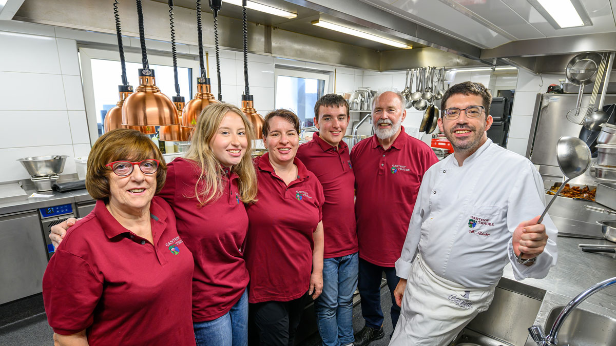 In der Traube „schafft“ die ganze Familie zusammen für gastronomische Qualität. In der guten Stube verströmt ein historischer Kachelofen wohlige Wärme. Diesen Hort der Behaglichkeit gestalten Binders mit viel Heimatverbundenheit. Fast alle Zutaten, die sie zu Gerichten aus der schwäbischen gut bürgerlichen Küche verarbeiten, stammen von hiesigen Erzeugern und Lieferanten.