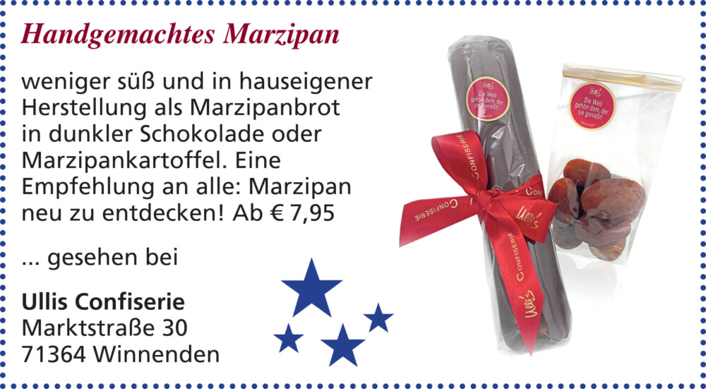 Weniger süß und in hauseigener Herstellung als Marzipanbrot in dunkler Schokolade oder Marzipankartoffel.
