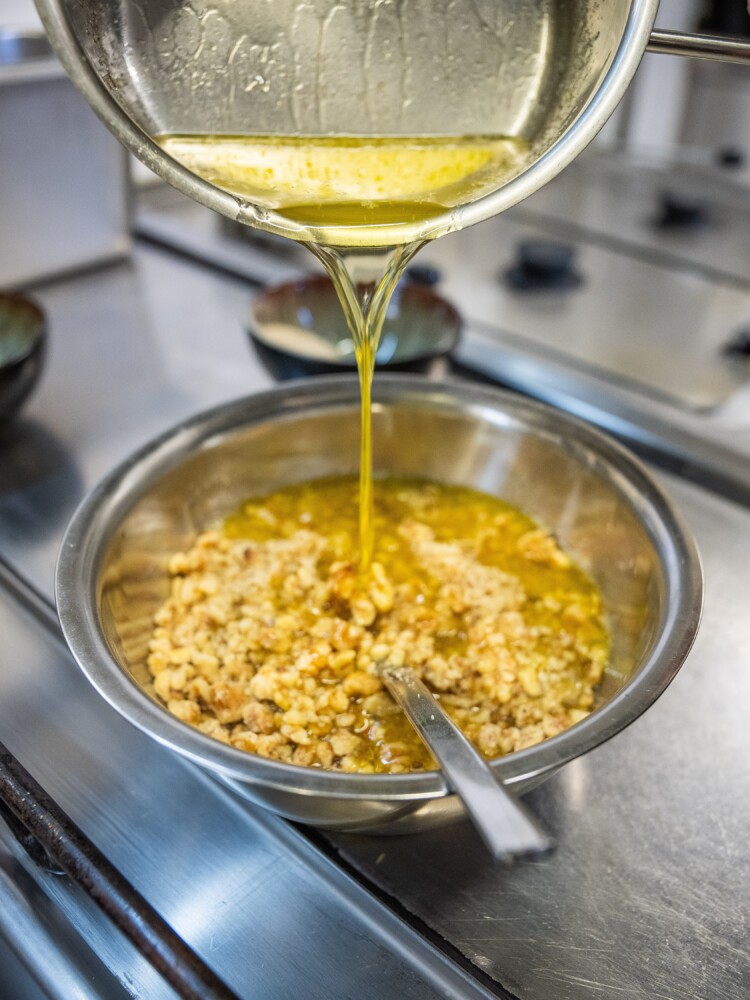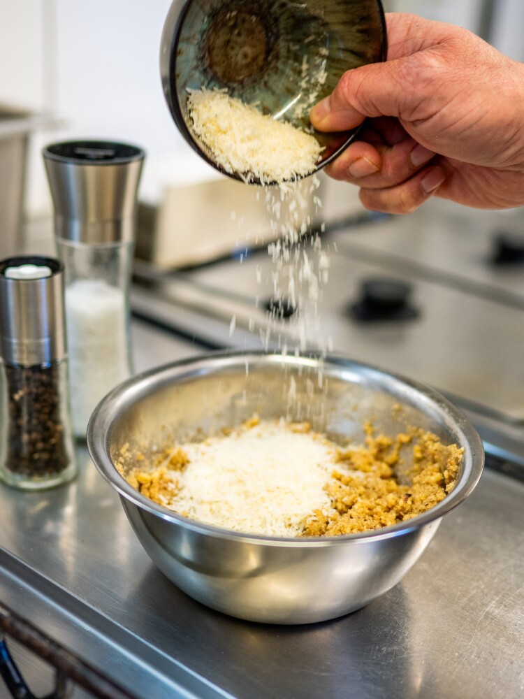 Walnusskruste: 200 g Walnüsse, 200 g Paniermehl, 250 g Butter, 2 EL geriebener Parmesan, 2 Prisen Salz, 1 Prise Pfeffer