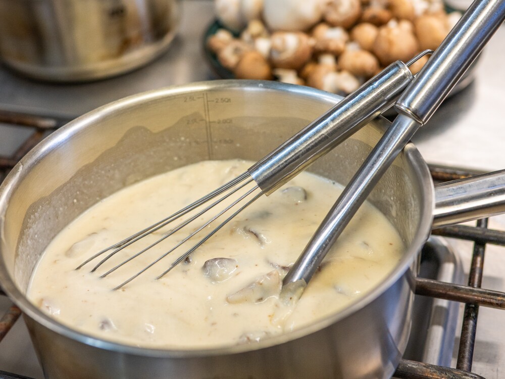 Am besten dafür geeignet ist eine Gewürzkugel oder ein Gewürzsieb. Dasselbe Ergebnis erzielt man aber auch mit der Schmormethode, die man zuhause ansonsten auch einsetzt. Den Ofen auf 140° Umluft vorheizen. Den Braten nun in den Bräter dazulegen und im Ofen ohne Deckel garen für circa anderthalb bis zwei Stunden. Nach dem Garen den Braten und die Gewürzkugel entfernen, so dass nur noch das Gemüse und der Sud übrig sind. Alles mit einem Pürierstab gut mixen und durch ein Sieb passieren, den restlichen Rotwein hinzugeben und alles köcheln lassen. Das ergibt die Wildsoße.