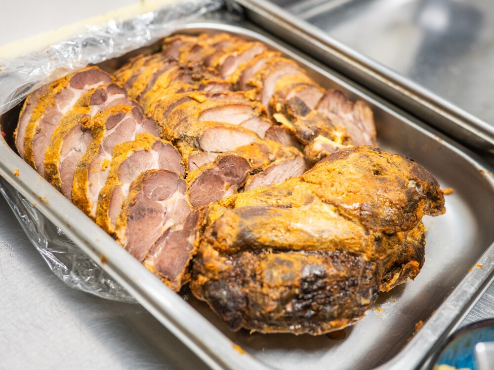 Im Küchenreich von Marcel Wörner liegt statt Keule ein Nackenstück im Bräter, das vom ausgebildeten Koch und Küchenchef für das weihnachtliche Wildschwein-Dinner vorbereitet wird. Er hat das Silberhäutchen abgezogen, das Fleisch gründlich unter fließend Wasser gewaschen, trocken gerieben. Vor dem Garen reibt er es mit Senf und Kräutern ein. Beim Garvorgang legt er den Schongang ein. „Es geht darum, Gewürze vor zu starker Hitze zu bewahren, die Saftigkeit zu wahren und die Ofenwärme sinnvoll zu speichern und auszunutzen.“ Wildschwein will zart angefasst werden: Wer es mit Zartheit gart und nicht schmort, dem „dankt“ das Fleisch mit einer saftigen, elastischen Zartheit und einem fein bissfesten Mundgefühl. Zudem braucht’s weder Einlegen in Marinade noch Buttermilch als „Weichmacher“.